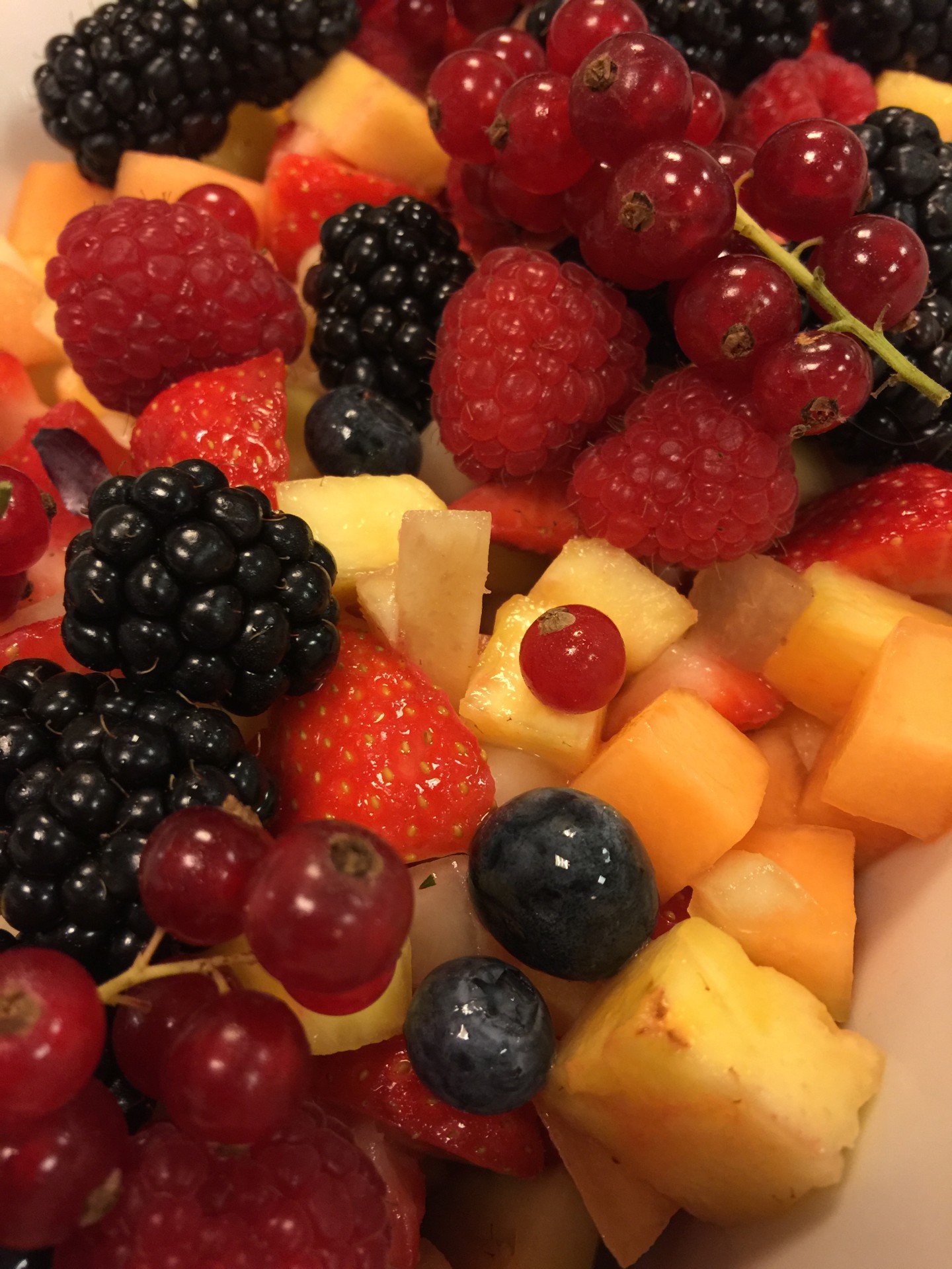 2 slags pålæg med tilbehør, 2 slags ost med druer, 2 slags marmelade, rørt yoghurt med knas og bær, lun selv leverpostej med bacon og champignon, sprødt bagværk, diverse brød og rundstykker og smør.