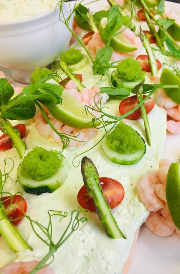 Marineret sild med karrysalat, Æg og rejer med mayo, røget ørred salat, fiskefilet med citron, roastbeef med passende tilbehør, mørbrad bøf a la creme med svampe, 2 slags ost med druer og kiks, 2 slags brød, smør og fedt)
