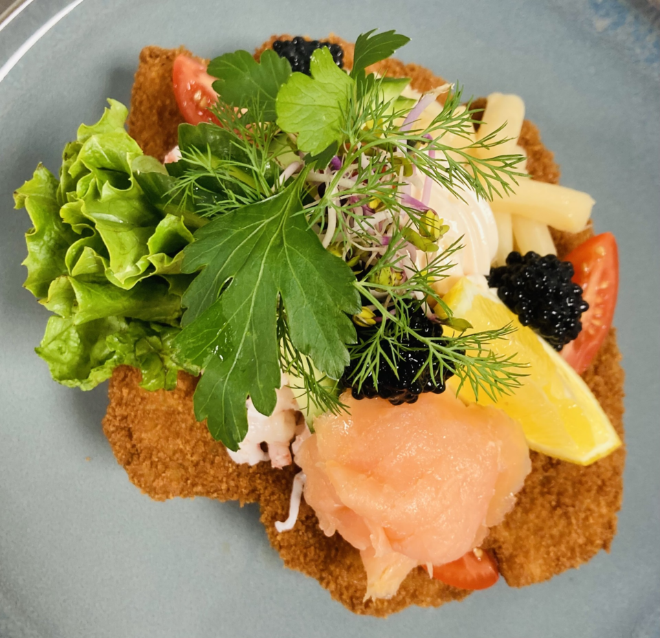 2 stegte fiskefileter, røget laks, dampet rødspætte, rejer, dampede grønne asparges, lækker dressing og pynt på franskbrød.